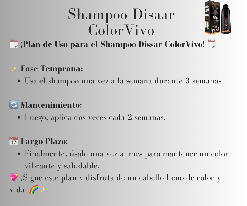 Renueva tu look con el Shampoo Dissar ColorVivo. Despídete de las canas y disfruta de un color vibrante y saludable. ¡Compra ahora y transforma tu cabello en cada aplicación! 💖